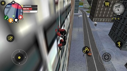 左侧移动、加速,右侧绳索,攻击(跳跃),跳跃,右上侧的武器更换以及血量、经验的显示都实时更新,一览无遗,凭借着大家自由的玩法,与其他帮派的人物进行交火,期间杀人能够获得经验,杀多了会产生星级,警察和其他附近角色会特殊照顾你对你展开火热的进攻,而如何存活,如何将其他人物击杀则是你所需要完成的任务。